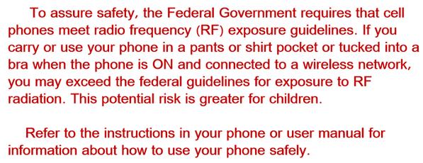 “To assure safety, the Federal Government requires that cell phones meet radiofrequency (RF) exposure guidelines. If you carry or use your phone in a pants or shirt pocket or tucked into a bra when the phone is ON and connected to a wireless network, you may exceed the federal guidelines for exposure to RF radiation. Refer to the instructions in your phone or user manual for information about how to use your phone safely.”