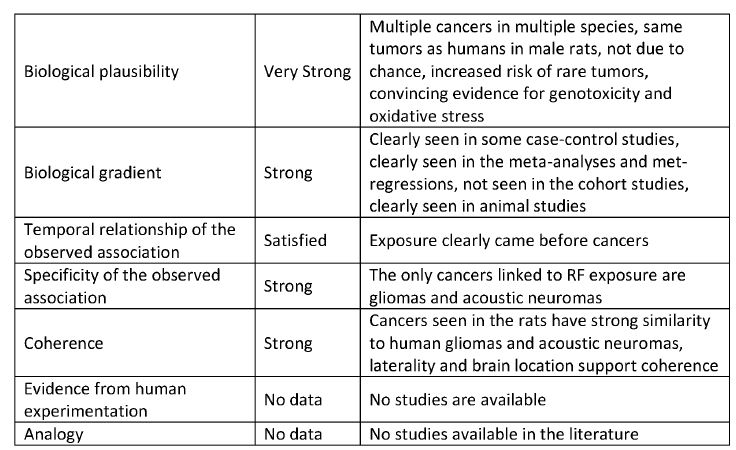 "The evidence on an association between cellular phone use and the risk of glioma in adults is quite strong. While there is considerable difference from study to study on ever versus never usage of cellular phones, 5 of the 6 meta-analyses in Figure 1. are positive and two are significantly positive. Once you consider latency, the meta-analyses in Figure 2 clearly demonstrate an increasing risk with increasing latency. The exposure response meta-regressions in Table 10 and Table 11 clearly indicate that risk is increasing with cumulative hours of exposure, especially in the highest exposure groups. There is a strong tendency toward gliomas appearing on the same side of the head as the phone is generally used and the temporal lobe is strongly suggested as a target. These findings do not appear to be due to chance. The cohort studies appear to show less of a risk than the case-control studies, but one study is likely to be severely impacted by differential exposure misclassification (Frei et al., 2007) and the other (Benson et al., 2012) is likely to have a milder differential exposure misclassification. The case-control studies are possibly impacted by recall bias although that issue has been examined in a number of different evaluations. Selection bias could have been an issue for the lnterphone study, but their alternative analysis using different referent groups reduces that concern. Confounding is not an issue here. In conclusion, an association has been established between the use of cellular telephones and the risk of gliomas and chance, bias and confounding are unlikely to have driven this finding. The ecological studies are of insufficient strength and quality to fully negate the findings from the observational studies.